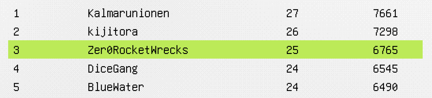 Last week I played Google CTF with Zer0RocketWrecks (merger between Zer0Tolerance, RedRocket and my team WreckTheLine). We managed to get 3rd place, with only 5 challenges remaining unsolved (out of 30). Looking forward to next year already!
