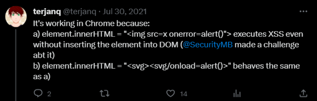 Url parsing differential: From this point forward it seems pretty clear, we need a way to trick the fetch into requesting a resource that we own (from there the attack is trivial, since it uses innerHTML we can just inject an img tag with onerror attribute to get the cookie).